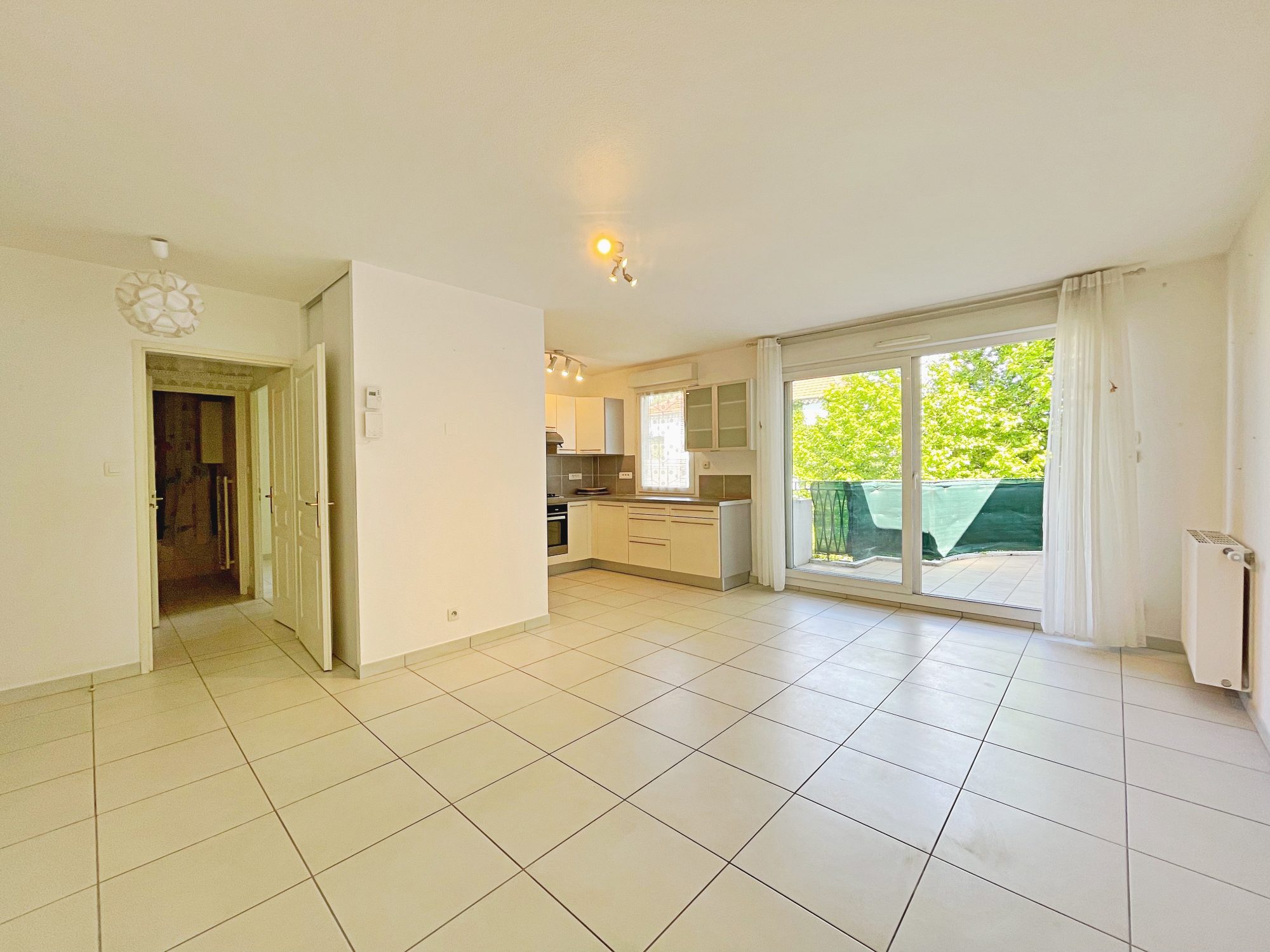 Cet appartement comprend : Un salon-séjour avec espace cuisine, donnant sur une terrasse équipée d’un store banne. Une chambre avec placard, une salle de bains et des toilettes séparées.