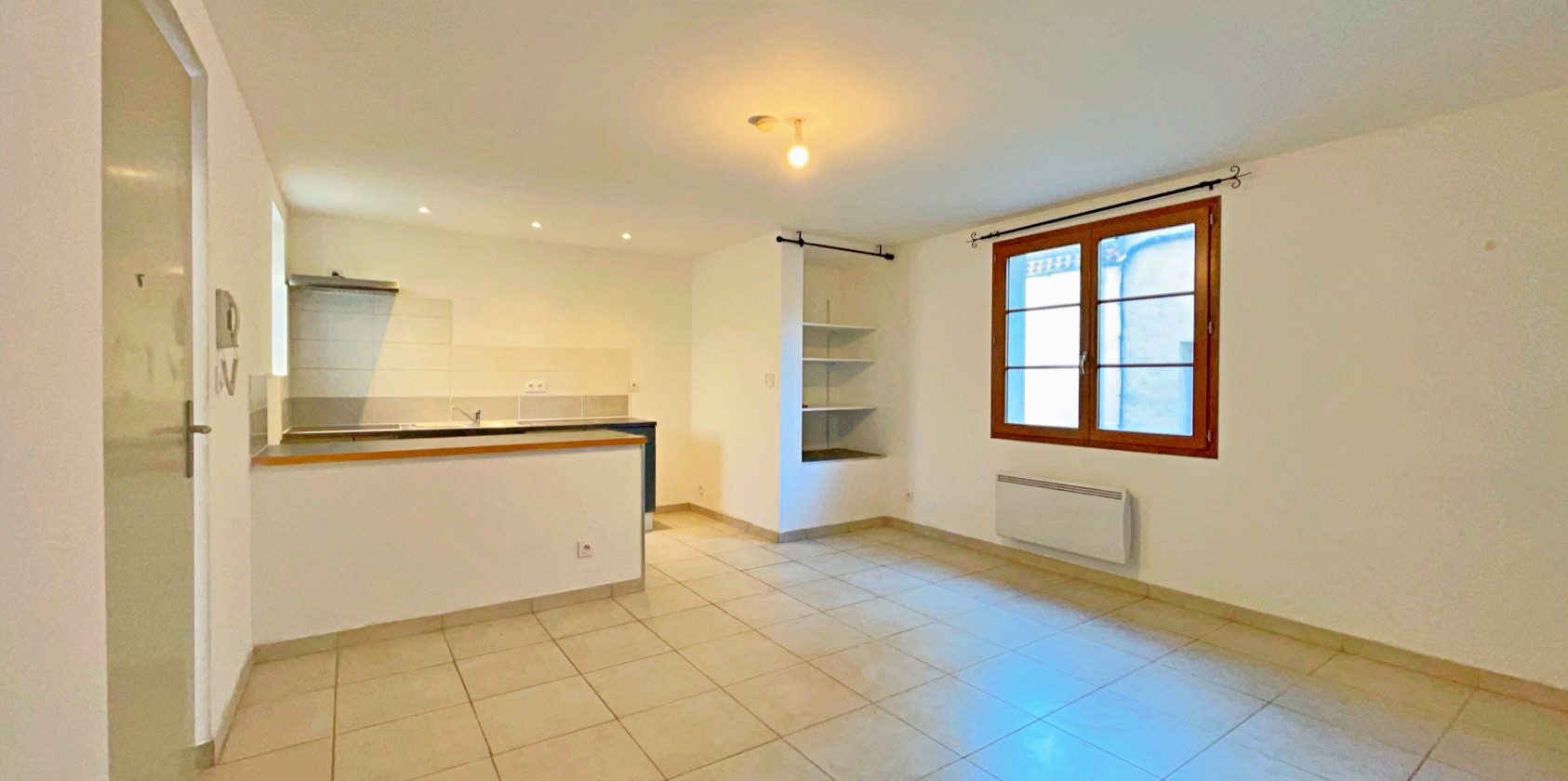 Centre-ville de Pierrelatte, appartement type 3 au 1er étage avec terrasse. Cuisine avec meubles bas, plaque vitrocéramique et hotte aspirante. Situation calme.