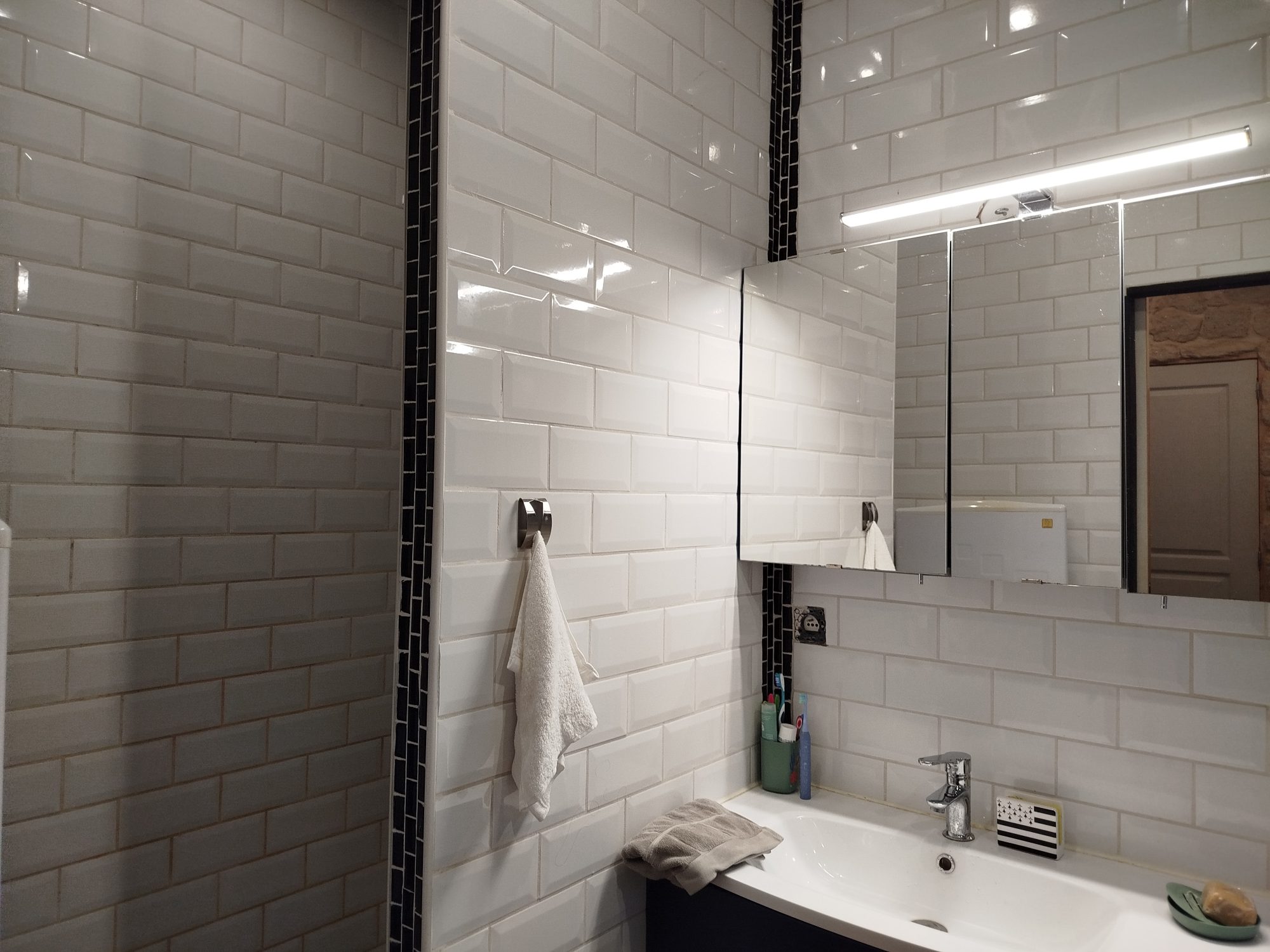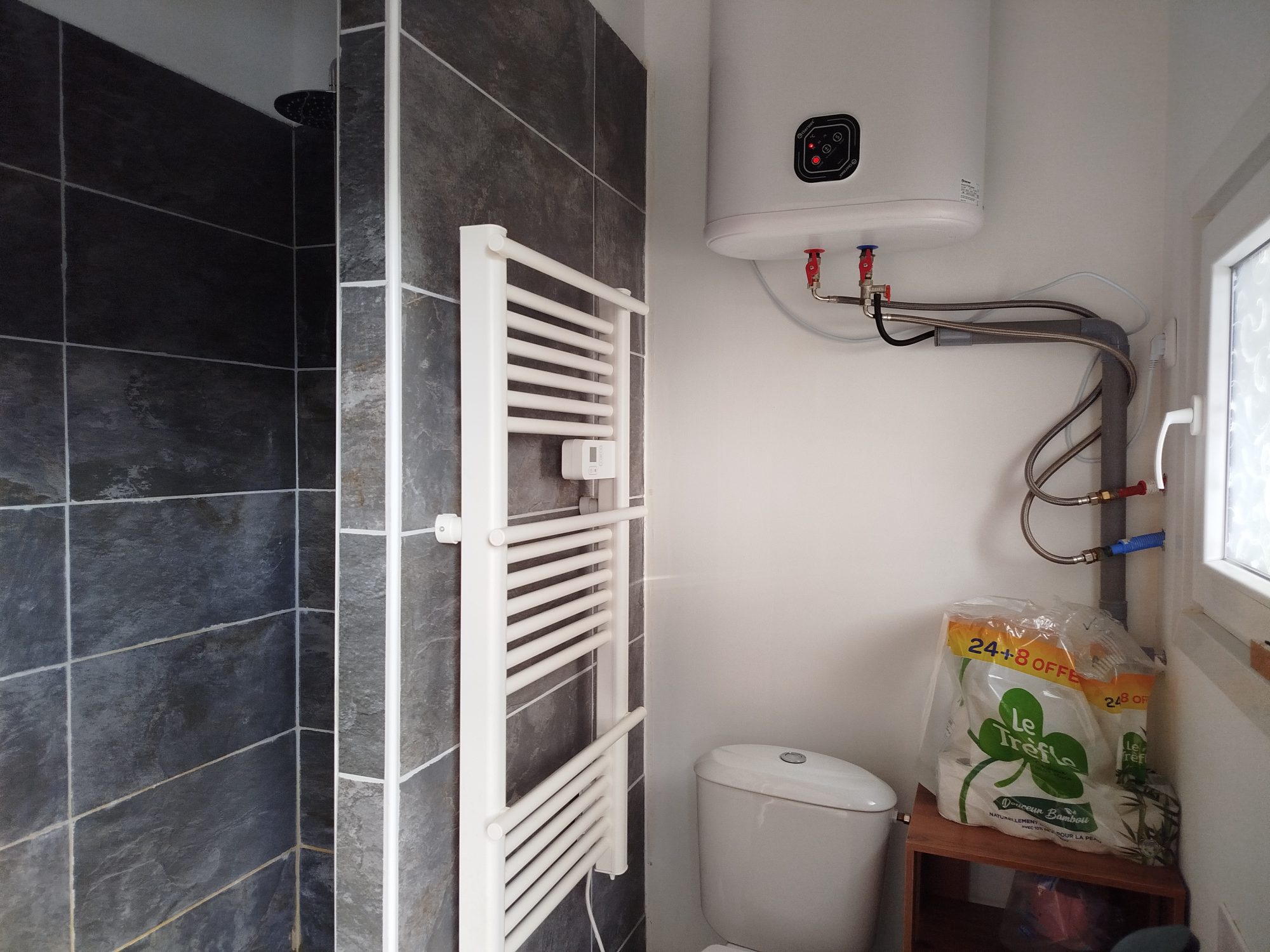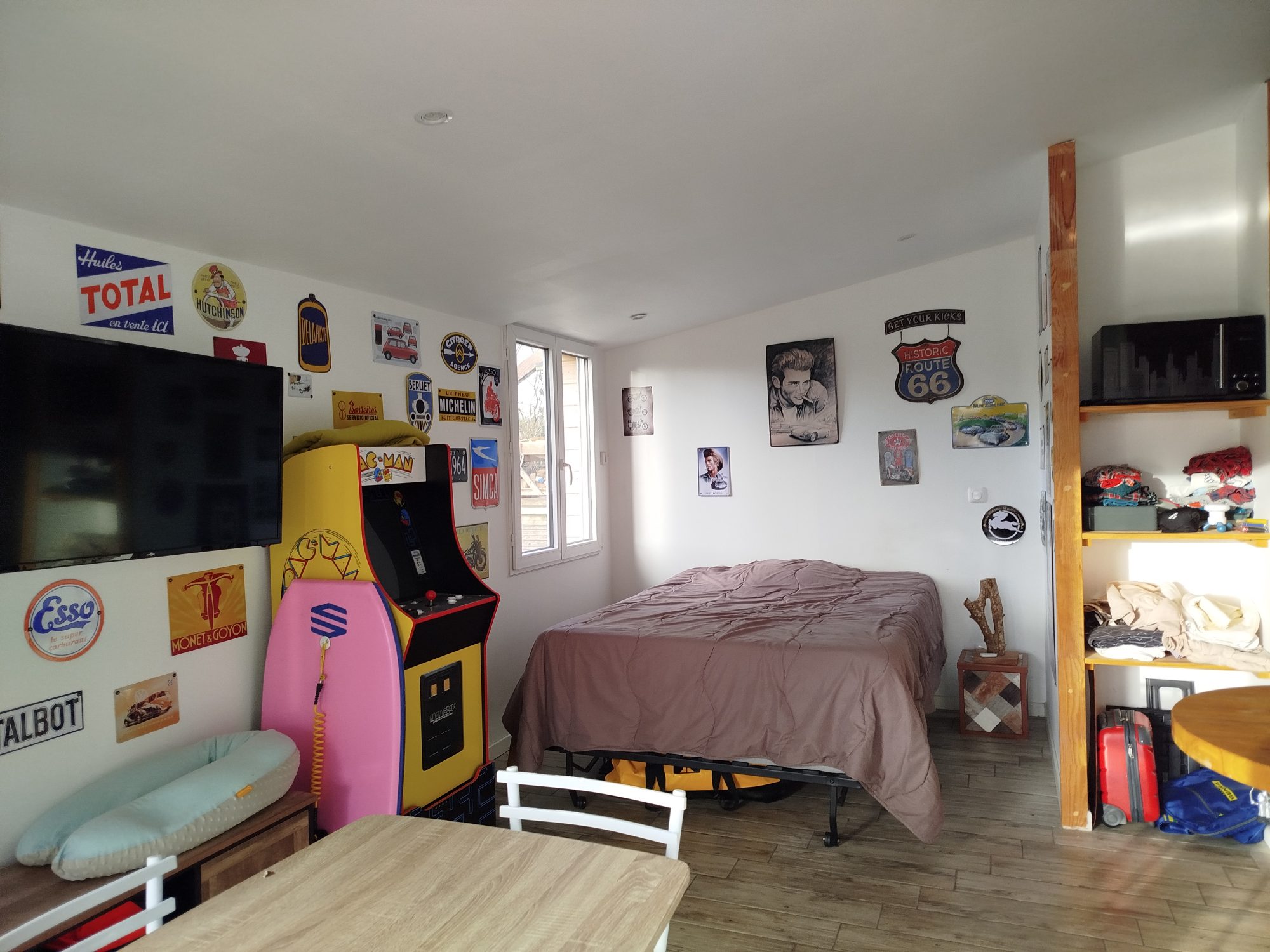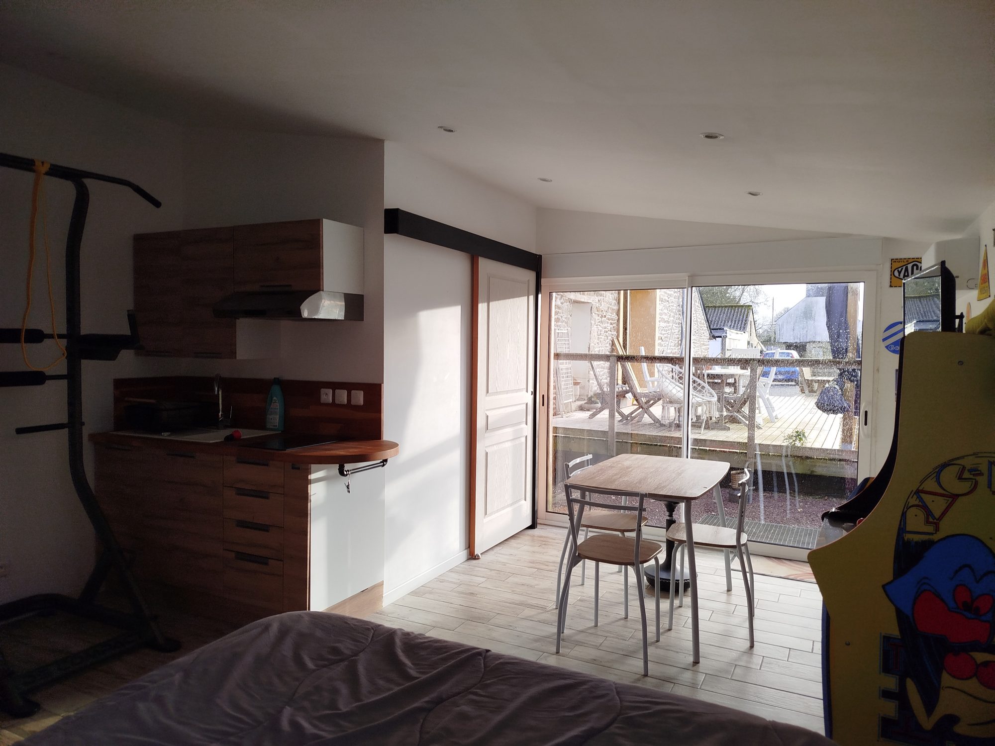 Gîte attenant comprenant un espace de vie avec coin cuisine, douche et WC.