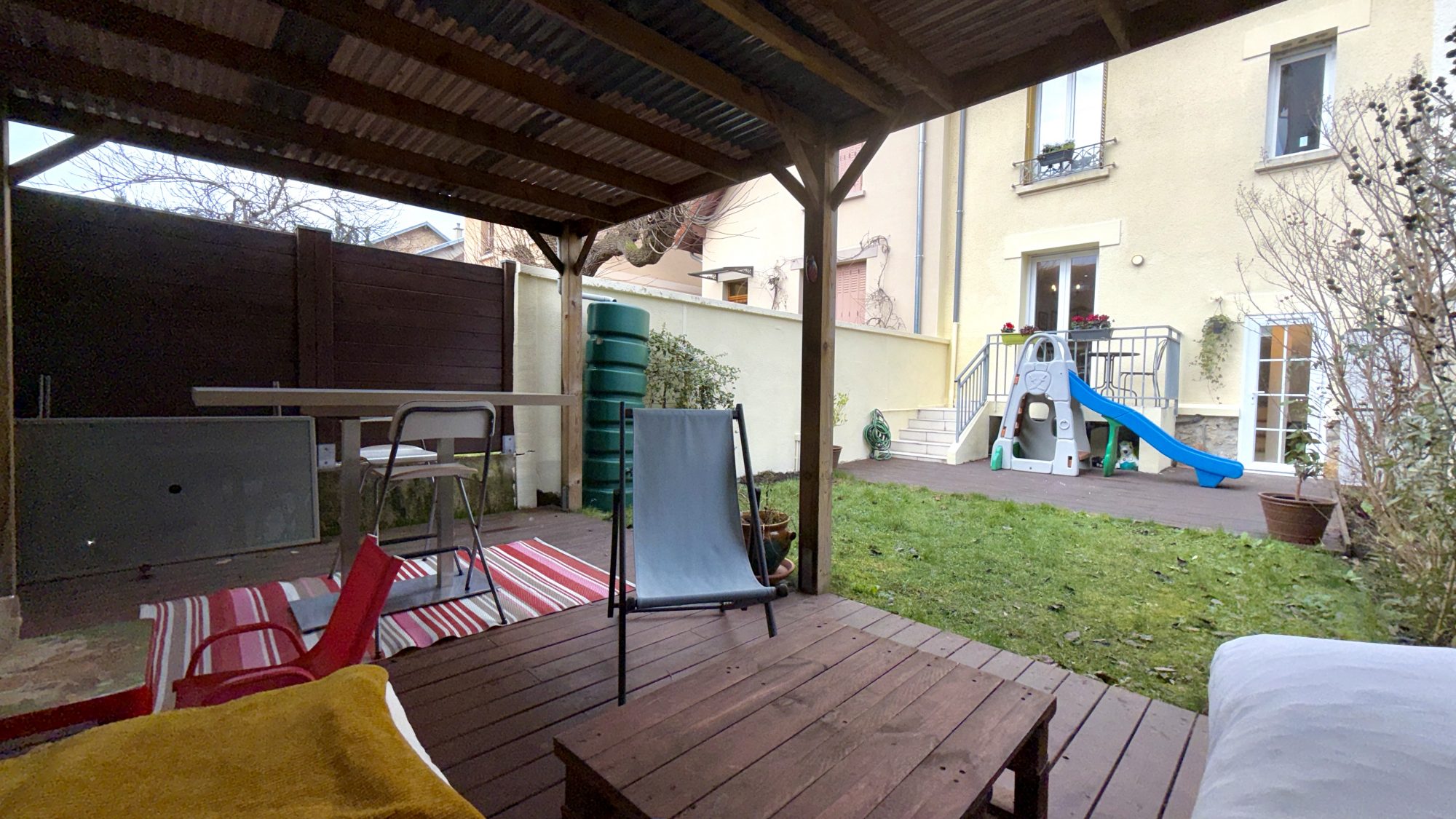 À l’extérieur, un jardin intimiste avec en supplément une terrasse et pergola, complète harmonieusement l’ensemble.