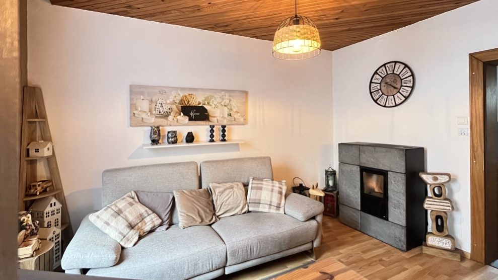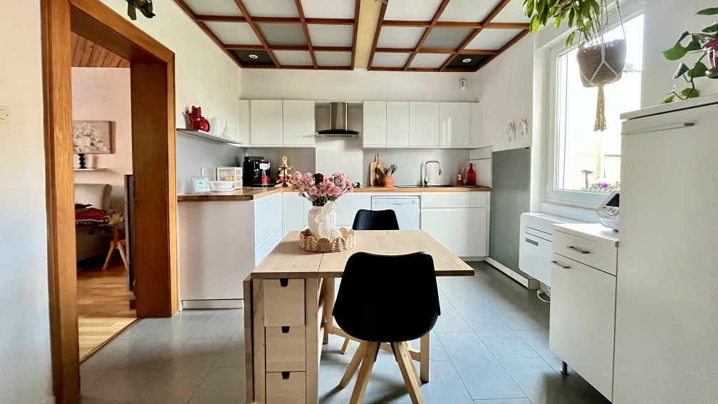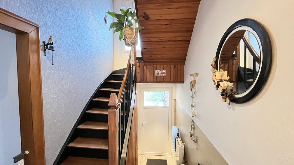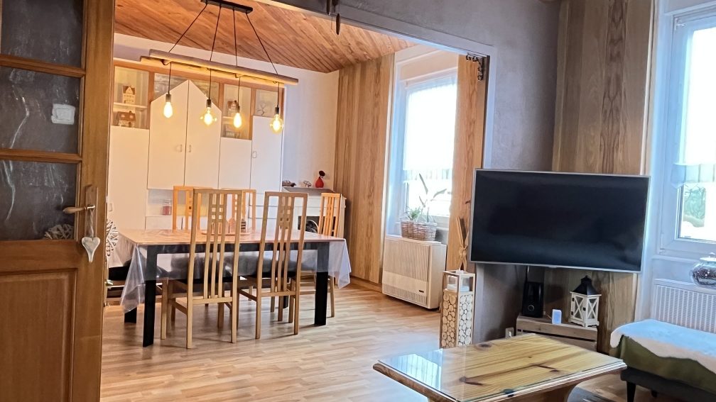 Belle maison de ville Mitoyenne d’environ 91 m² au charme d’antan et cocooning entretenue avec soin comprenant au RDC : Une cuisine récente entièrement équipée, un salon séjour avec poêle à Pellet et un wc.