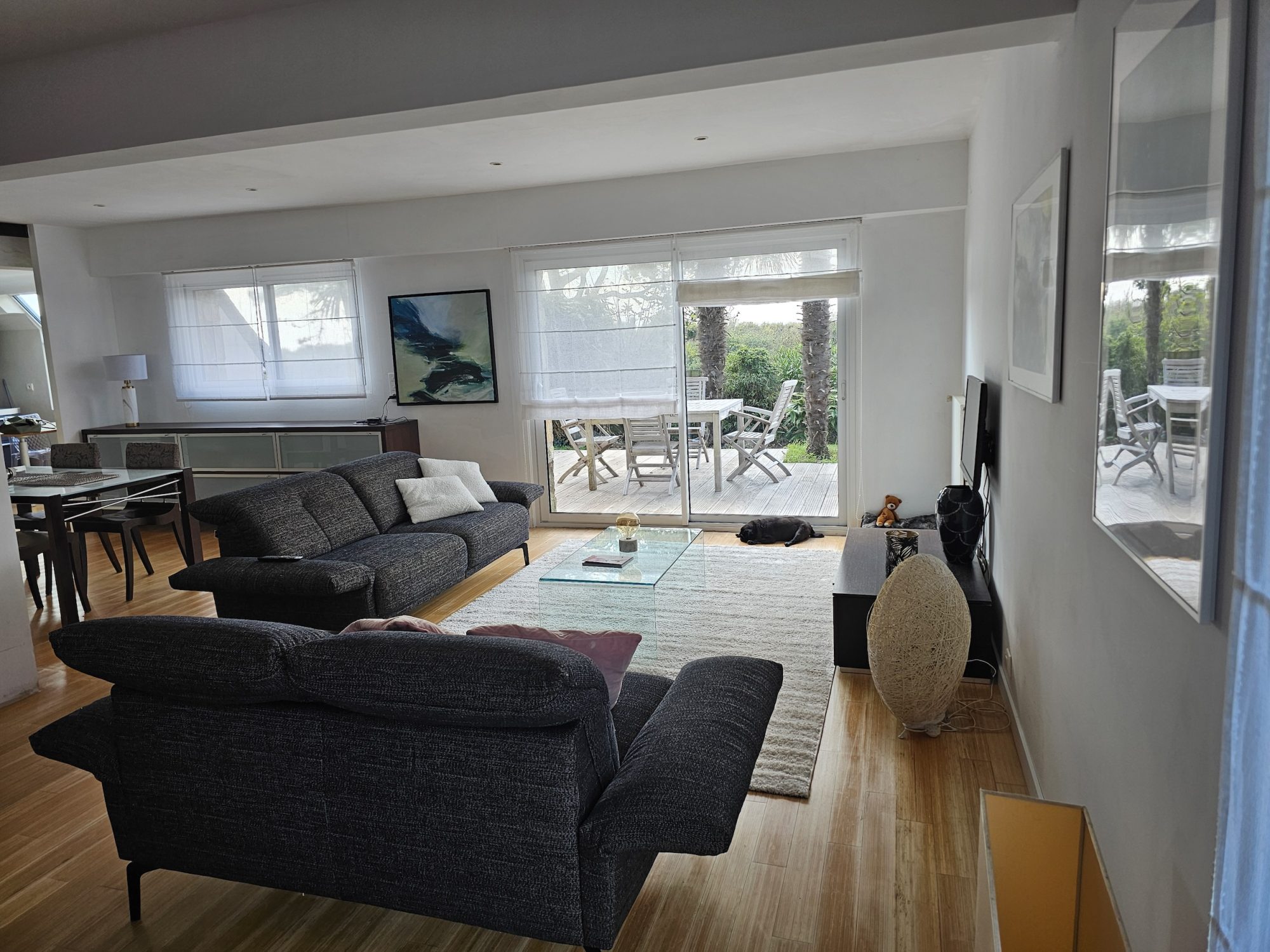 Un cadre idyllique pour cette belle maison spacieuse de 130 m2 environ, ouverte sur le jardin face à la mer, offrant la possibilité d’une extension de 100 m2.