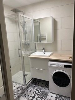 SDD avec douche neuve, sèche-serviettes électrique et machine à laver récente.
