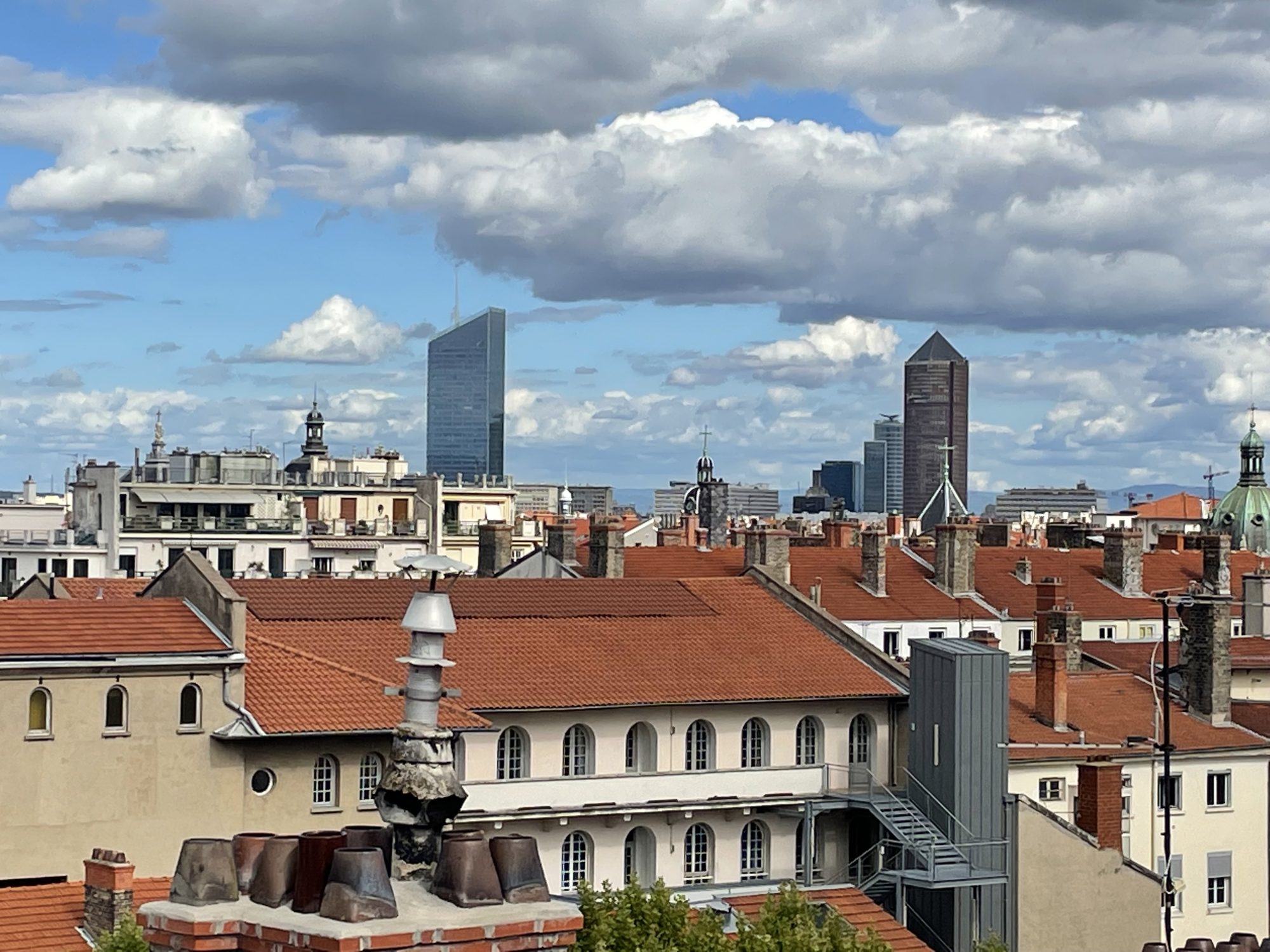 Nous vous proposons une MAISON unique ( de 50m² sur deux niveaux ) POSEE SUR LES TOITS , au dernier étage d’un immeuble de très très haut standing ( avec un ascenseur ) proposant une VUE PANORAMIQUE sur tout Lyon à couper le souffle ( de la basilique de fourvière à la skyline de la Part Dieu) dans un environnement au calme absolu ( Aucun voisin en mitoyenneté )