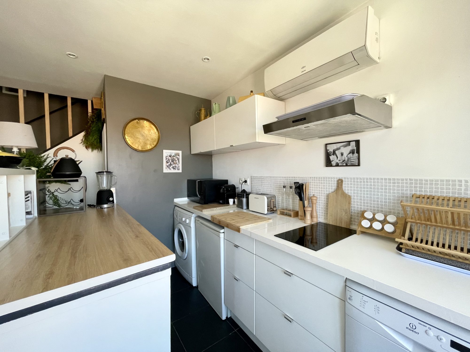La maison composée de deux niveaux. Au premier niveau une grande cuisine américaine avec îlot centrale faisant office de bar et table de salle à manger.