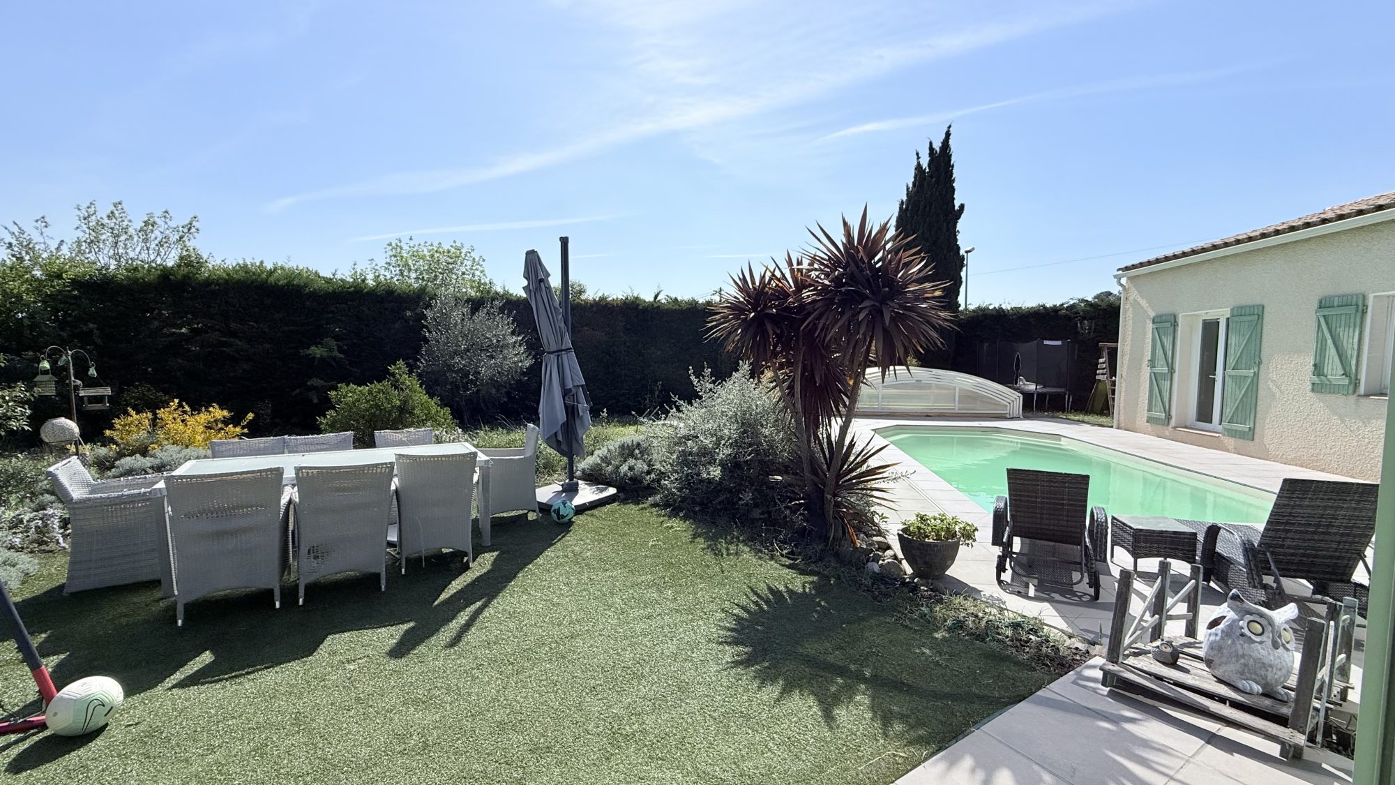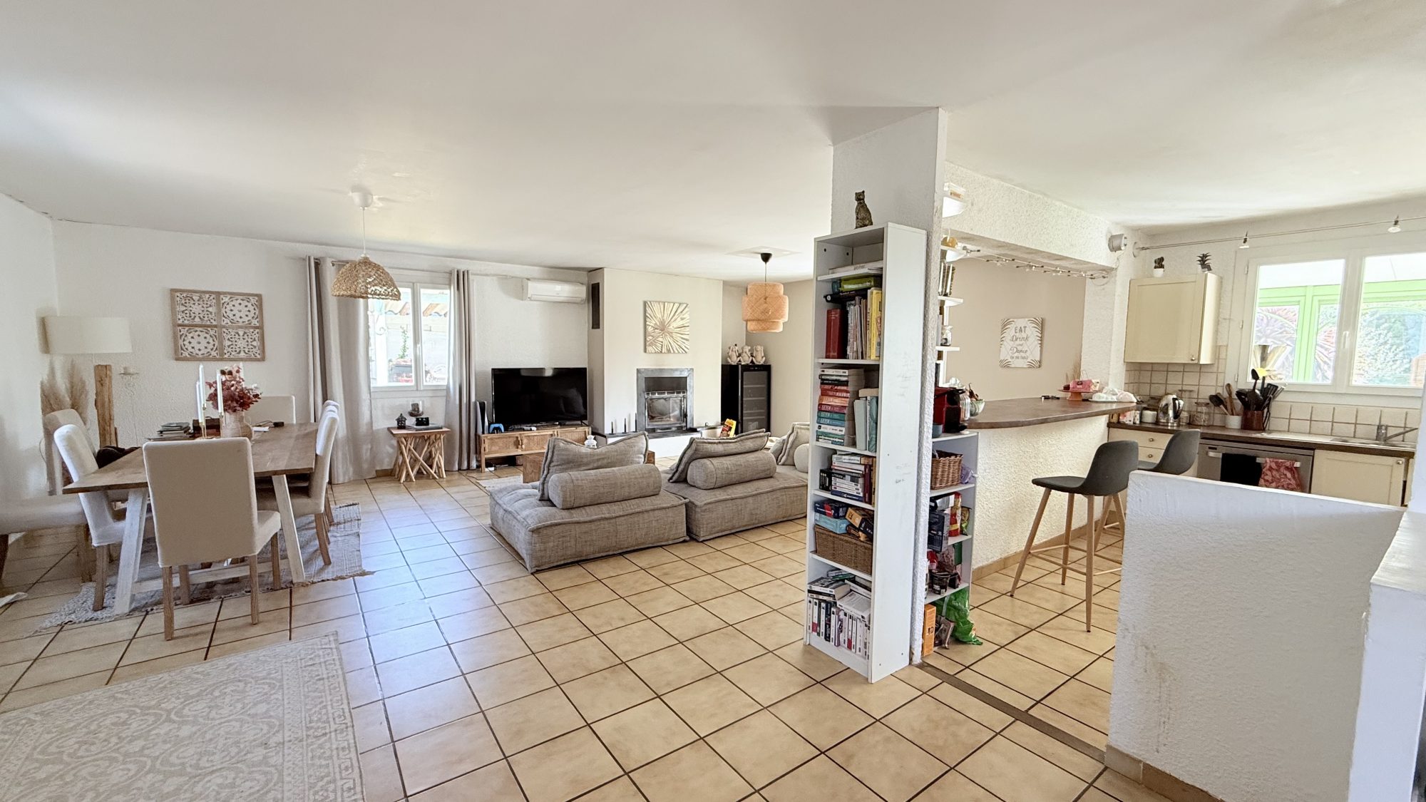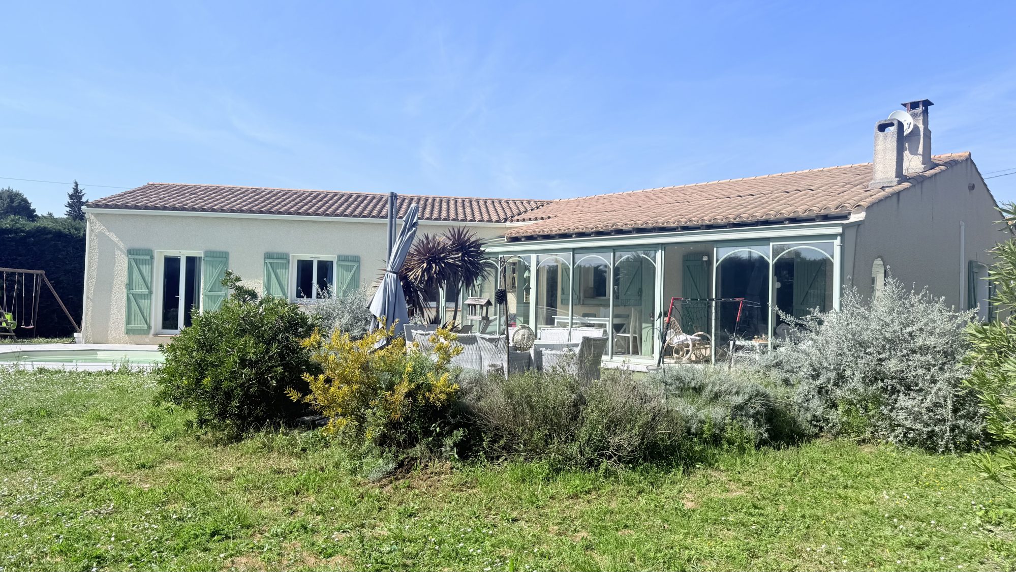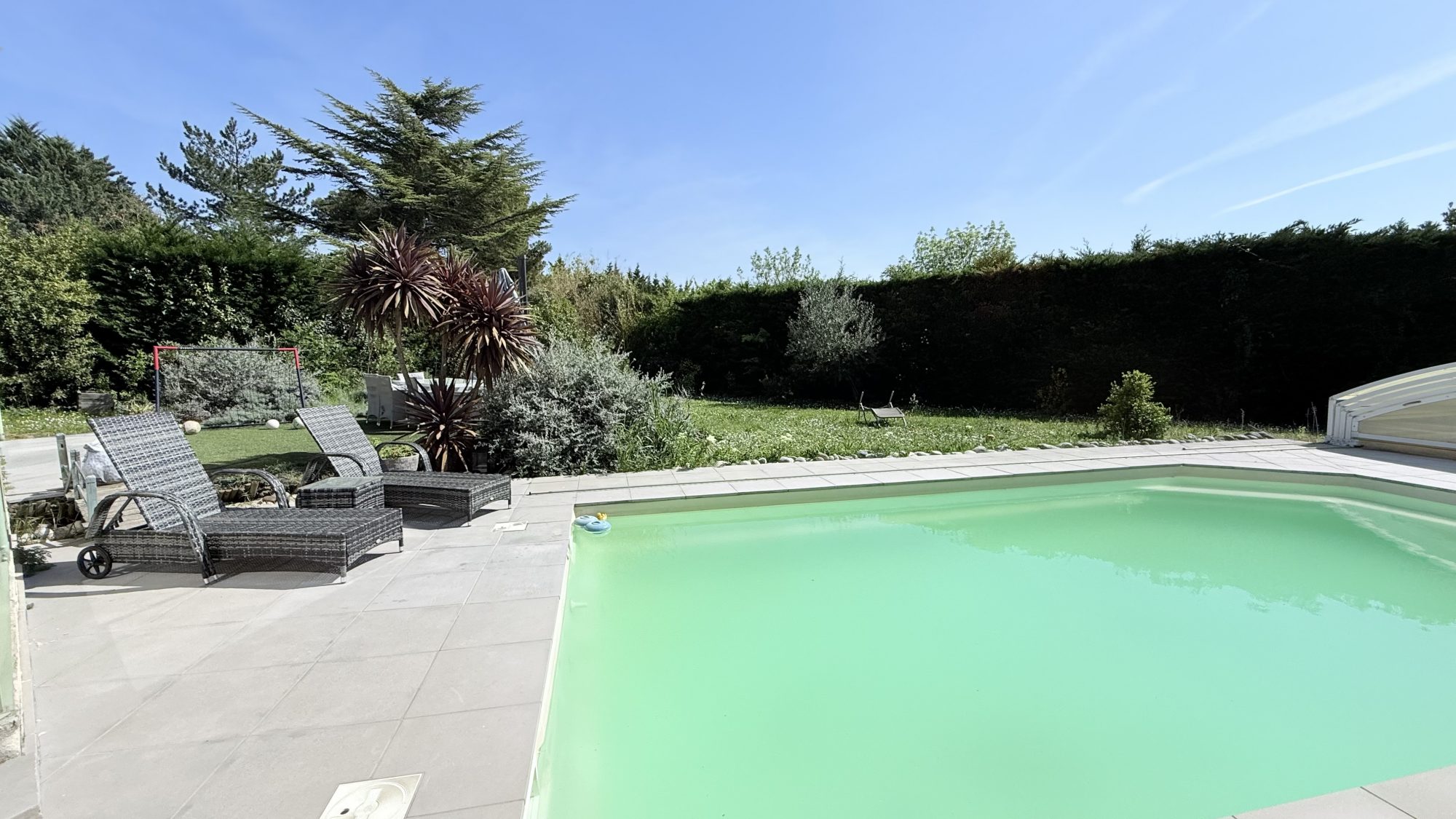 Descriptif :Grande entrée 8m² ouvrant sur une cuisine aménagée et équipée, avec une arrière-cuisine pratique pour le rangement et l’organisation.Cuisine ouverte 14m² sur un vaste séjour/salon 50m² (avec une belle cheminée, idéale pour les soirées d’hiver chaleureuses) 5 chambres spacieuses (entre 10 et 15m²) avec nombreux rangements.2 salles d’eau et 2 WC aux normes PMR.Séjour donnant sur une magnifique véranda de 30m² avec vue et accès direct au jardin et à la piscine. Piscine chauffée de 10x5m, protégée par un dôme.Double vitrage aluminium/PVC assurant une excellente isolation.Terrain clos et arboré de 1340m² avec portail automatique.Dépendances dans le jardin, offrant des espaces supplémentaires.À seulement 5 minutes de toutes les commodités (commerces, écoles, transports).